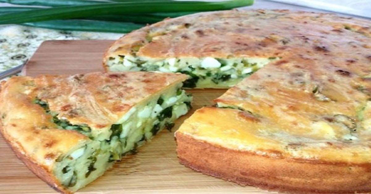 Puikus kefyro pyragas su kiaušiniais ir žaliaisiais svogūnais