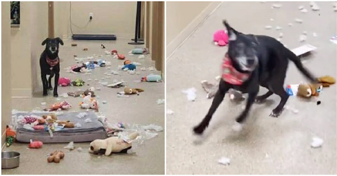 Šuo iš prieglaudos išlipa iš maniežo ir visą naktį žaidžia su cypiančiais žaislais