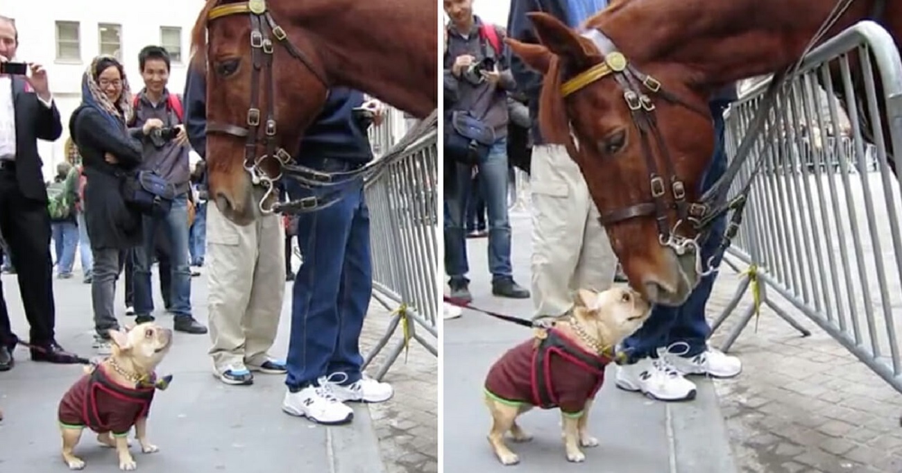 Širdį džiuginantis drąsaus mažo šuns ir policijos arklio susitikimas
