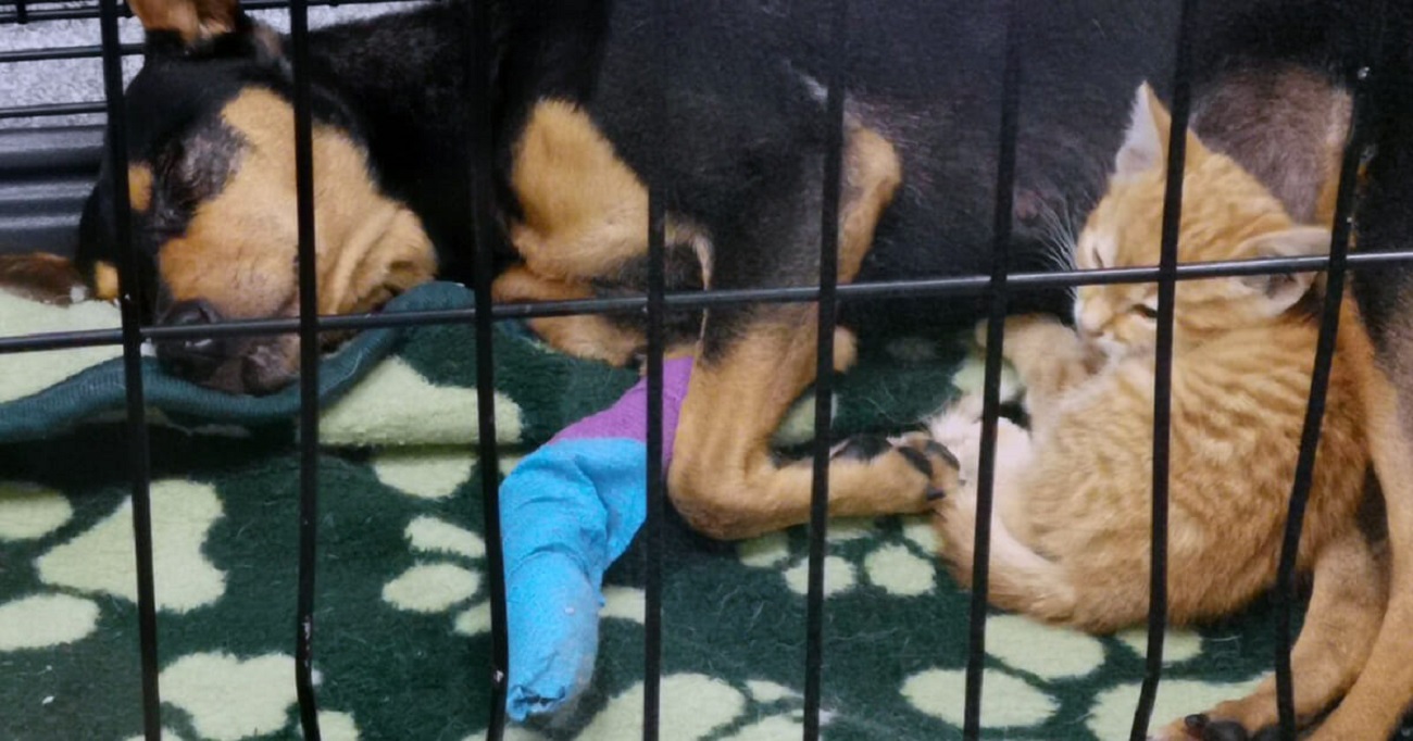 Iš gatvės išgelbėtas kačiukas ištrūko iš narvo ir ėjo paguosti išsigandusio šuns