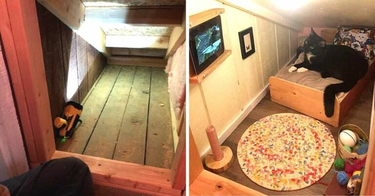 Nenaudojama namų erdvė tapo unikaliu katės kambariu, kuriame yra televizorius!