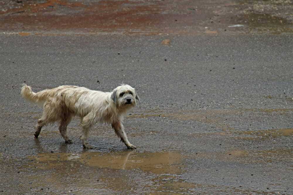 Policijos pareigūnas per stiprų lietų dalijosi skėčiu su benamiais šunimis ir sulaukė populiarumo internete