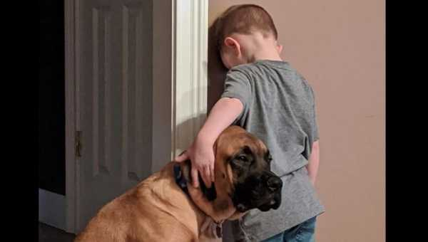 Tikras draugas, kai linksma ar liūdna. Ištikimas šuo palaiko berniukui draugiją, kuris stovi kampe…