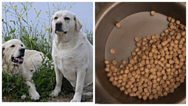Šuo suėda tik pusę dubenėlyje esančio maisto, kad jo draugas turėtų ką valgyti