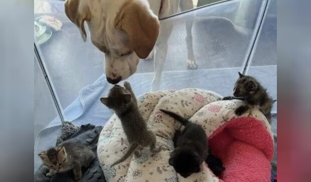 Šuo iš prieglaudos rūpinasi paliktu kačiuku