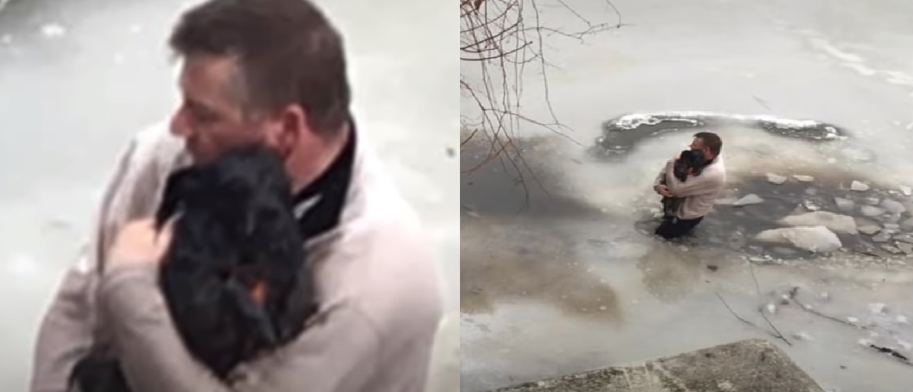 Vyras puola į ledinį vandenį, kad išgelbėtų šunį