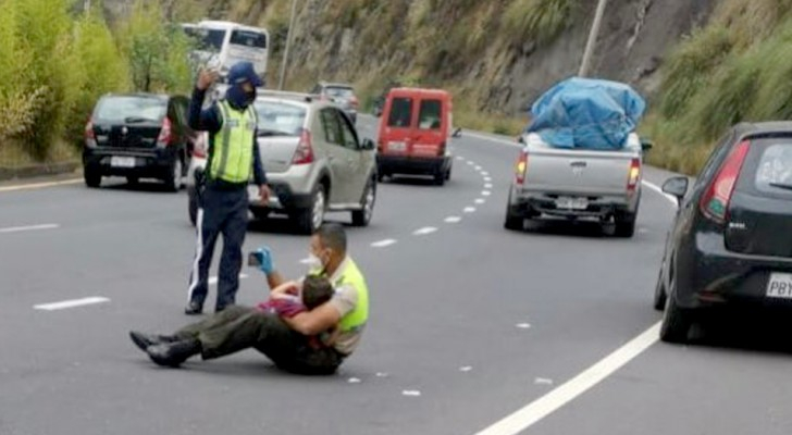 Nuotrauka, kurioje policininkas vidury kelio sėdi su 4 metų vaiku ant kelių, sujaudino visą pasaulį