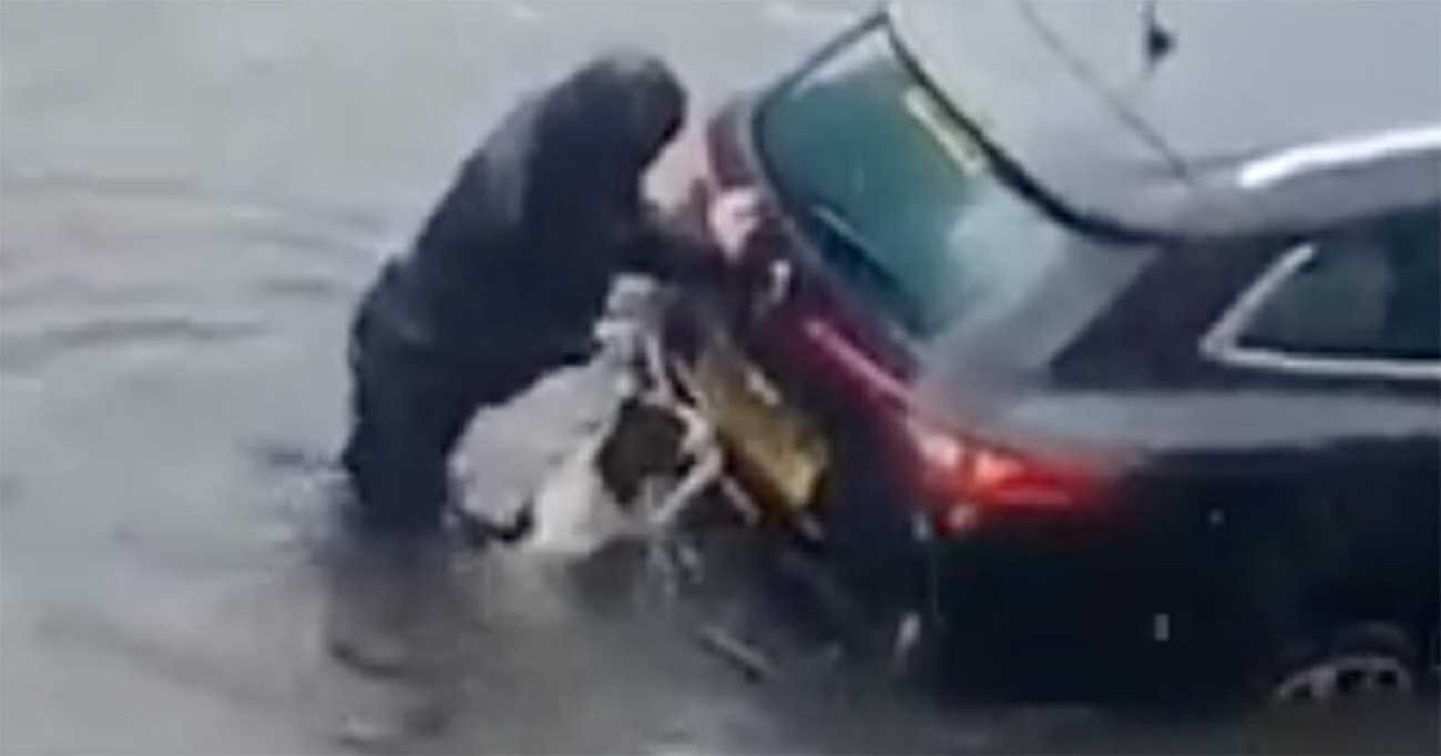 Šuo padėjo šeimininkui išstumti apsemtą automobilį iš vandens