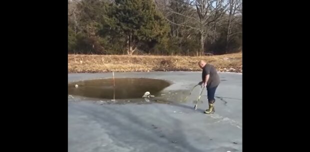 Vyras nusprendė lipti ant plono ledo, kad išgelbėtų kaimyno šunį, įstrigusį eketėje