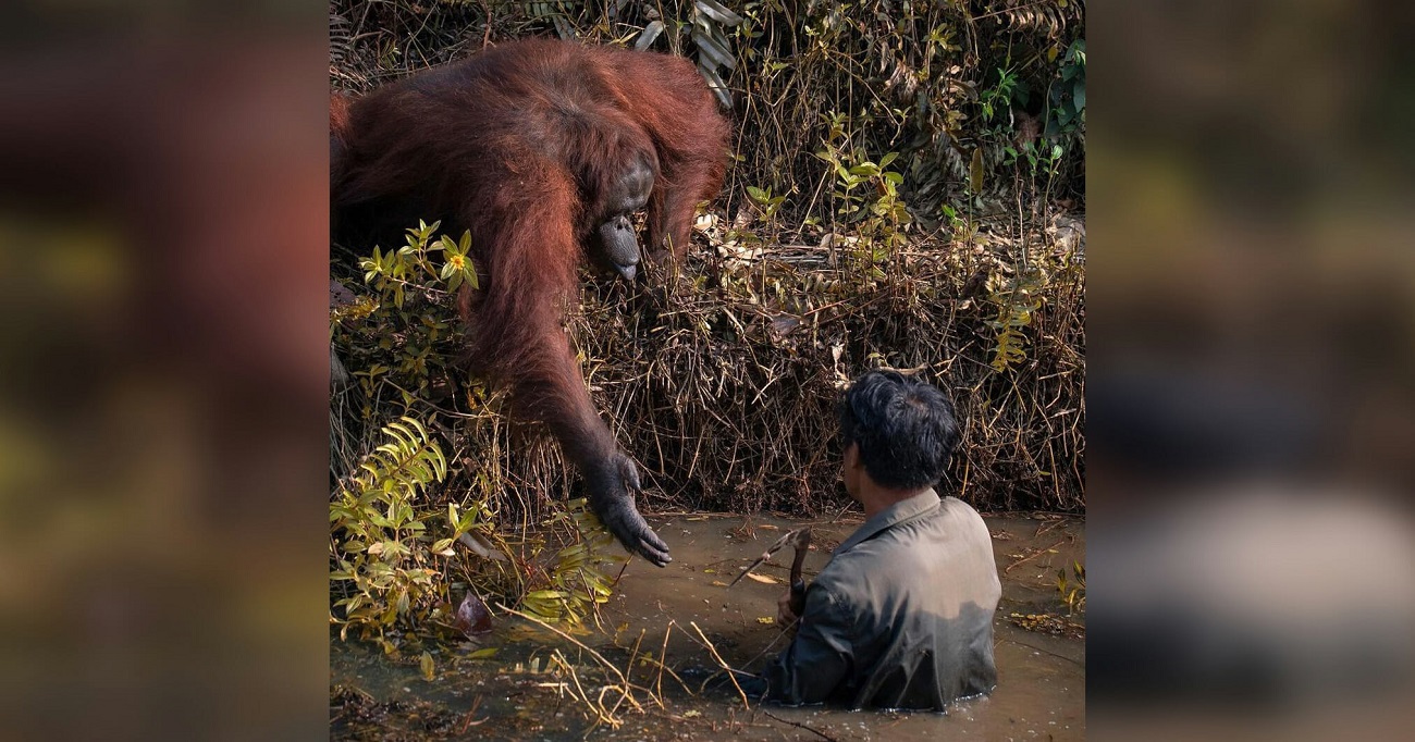 Orangutanas ištiesia ranką, kad padėtų žmogui, įklimpusiam į purvą