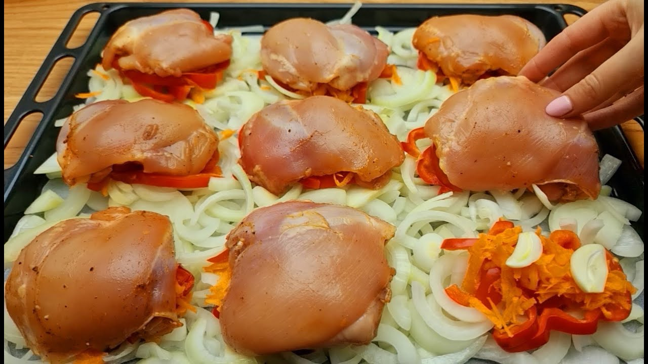 Vištienos šlaunelės su daržovėmis iš vienos kepimo skardos. Labai skanūs ir gardūs pietūs!