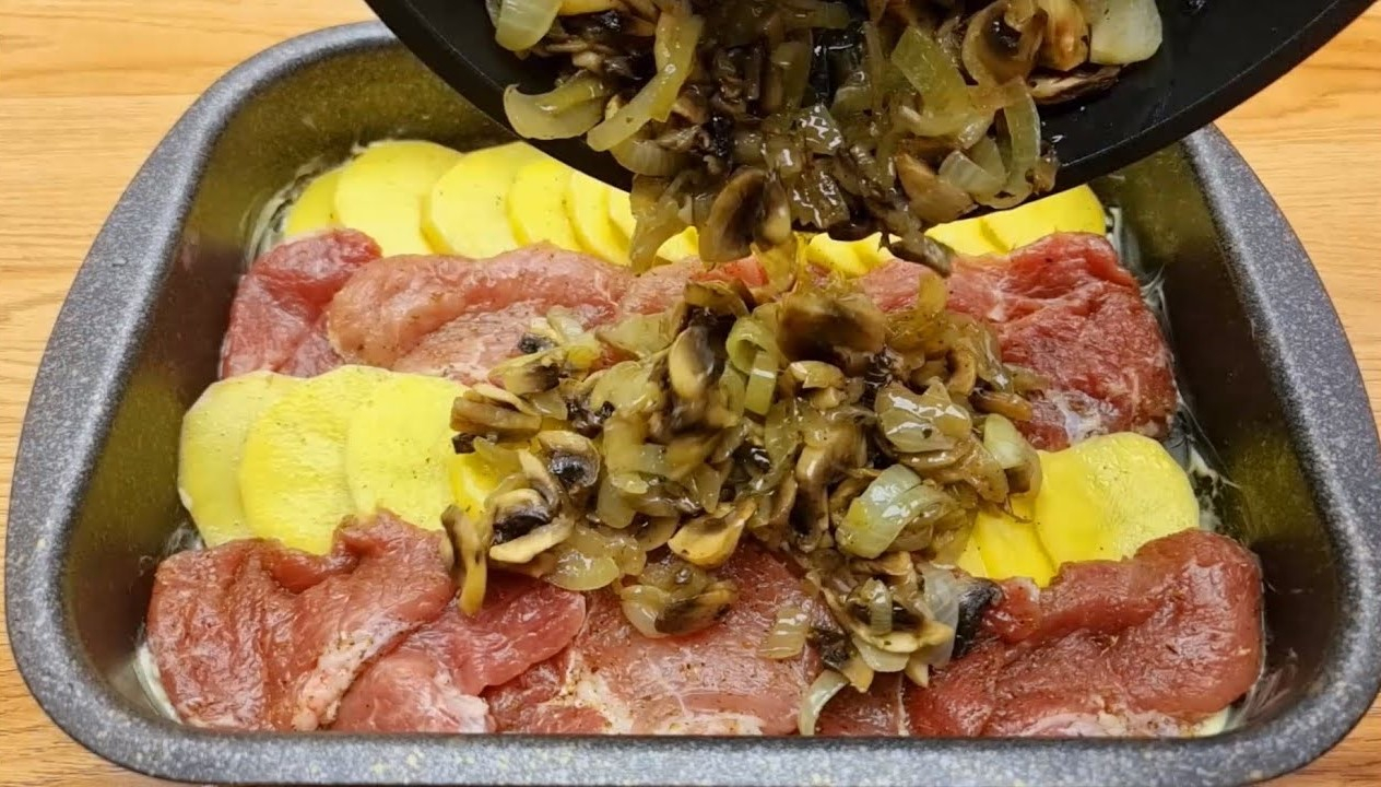 Sultingi kiaulienos kepsneliai su grybais ir bulvėmis. Puikus maistas kaip pas močiutę!