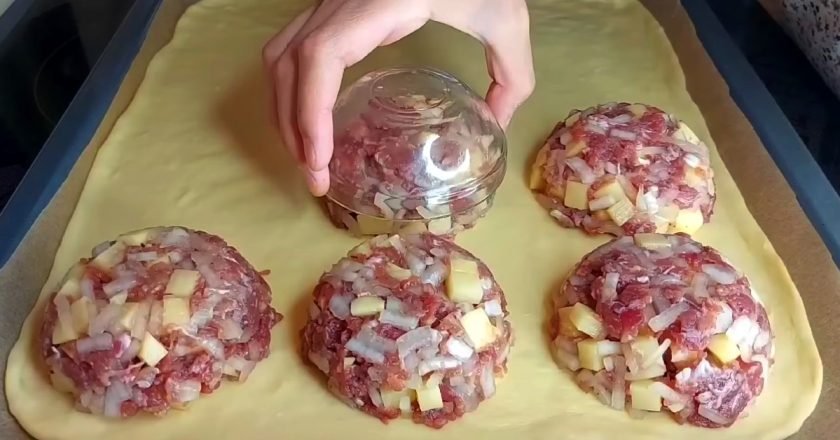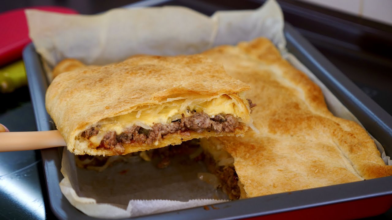 Sluoksniuotos tešlos pyragas su mėsa ir sūriu: mano vyras visada džiaugiasi, kai gaminu šį patiekalą