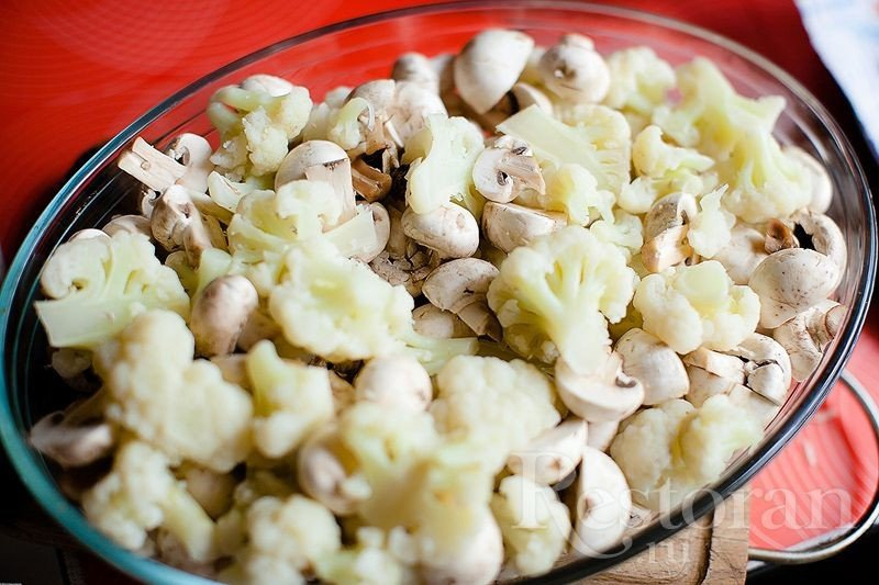 Žiedinių kopūstų užkepėlė su įvairiausiais priedais ir kreminiu parmezano padažu