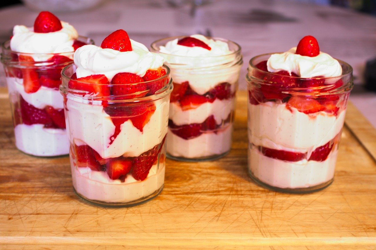 Braškių ir sūrio pyragas stiklinėse, kurį paruošėte per 10 minučių