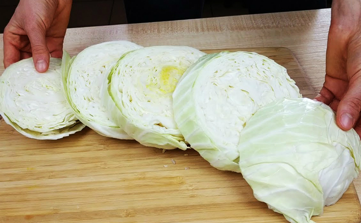 Kopūsto griežinėlius išdėliojame ant kepimo skardos ir dedame į orkaitę