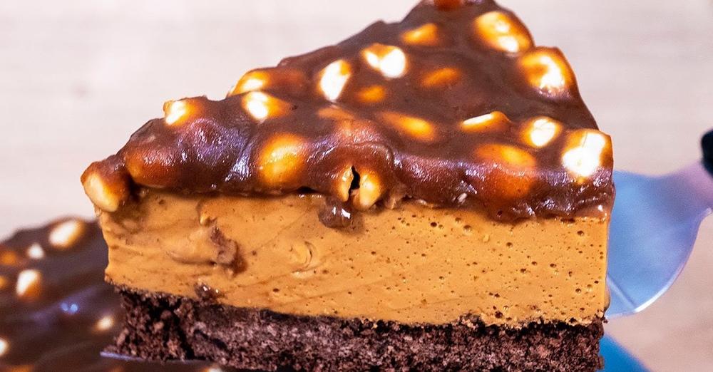 „Snickers“ skonio sūrio pyragas, kurio nereikia kepti: grietinė ir kondensuotas pienas