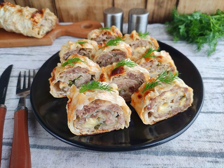 Lavašo vyniotinis su faršu ir rūkytu sūriu
