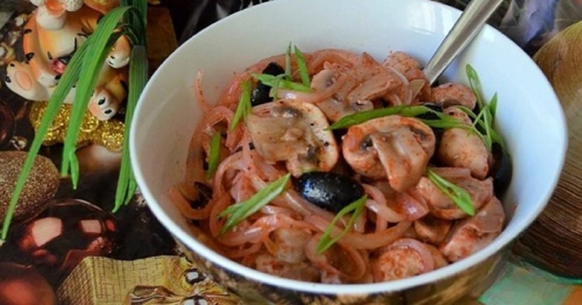 Greitas užkandis su marinuotais grybais, svogūnais ir alyvuogėmis