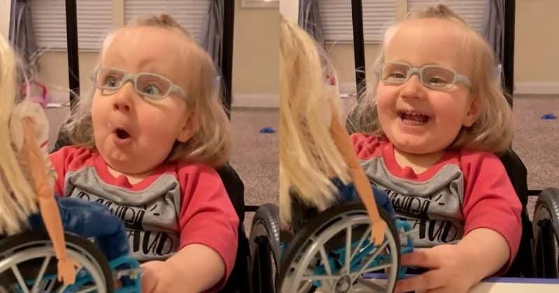 Dviejų metų Ella apsidžiaugė, kad gavo dovanų Barbę, sėdinčią neįgaliojo vežimėlyje