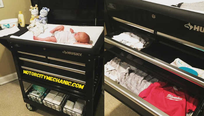 Kai automobilių mechanikas laukė savo dvynukių, iš įrankių vežimėlio pagamino labai ypatingą vystymo stalą