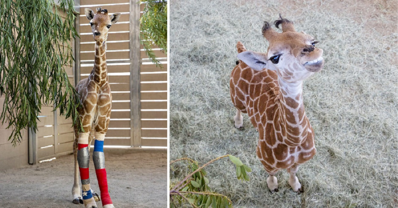 3 mėnesių žirafa dėvėjo specialius įtvarus, kurie padėjo tvirtai atsistoti ant kojų