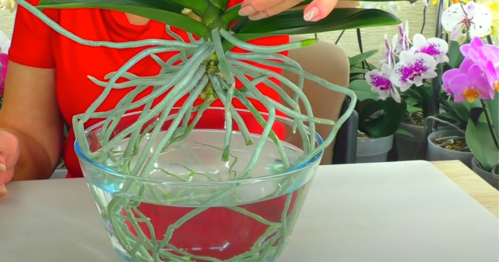 Taip pat reikėtų pašalinti visas nupjautas šaknis, paliekant tik visas antžemines šaknis. Prieš sodinant orchidėją į dirvą, visas antžemines šaknis 30-40 minučių palaikykite maždaug 30 laipsnių temperatūros vandenyje. Tai reikia daryti atsargiai, kad nepažeistumėte augalo. Jei šaknys stipriai išsikerojusios, naudokite didelį indą.