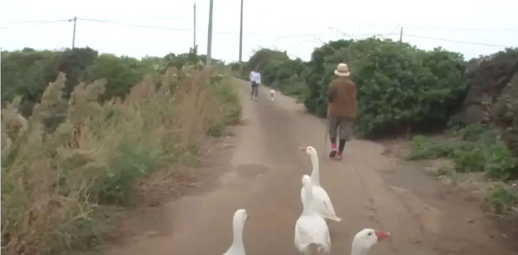 Bet tada pas ją atėjo keturios žąsys! Žąsys nusprendė būti prie moters namo. Ir ten jos apsigyveno. Šiandien žąsys yra geriausios jos draugės. Pagyvenusi moteris sako, kad myli savo žąsis, nes jos niekada nesmerkė, kai ji sirgo.