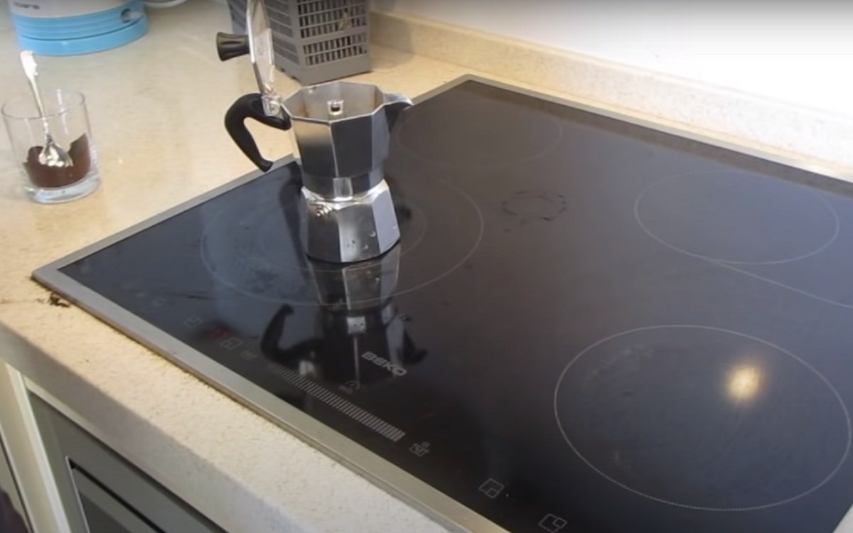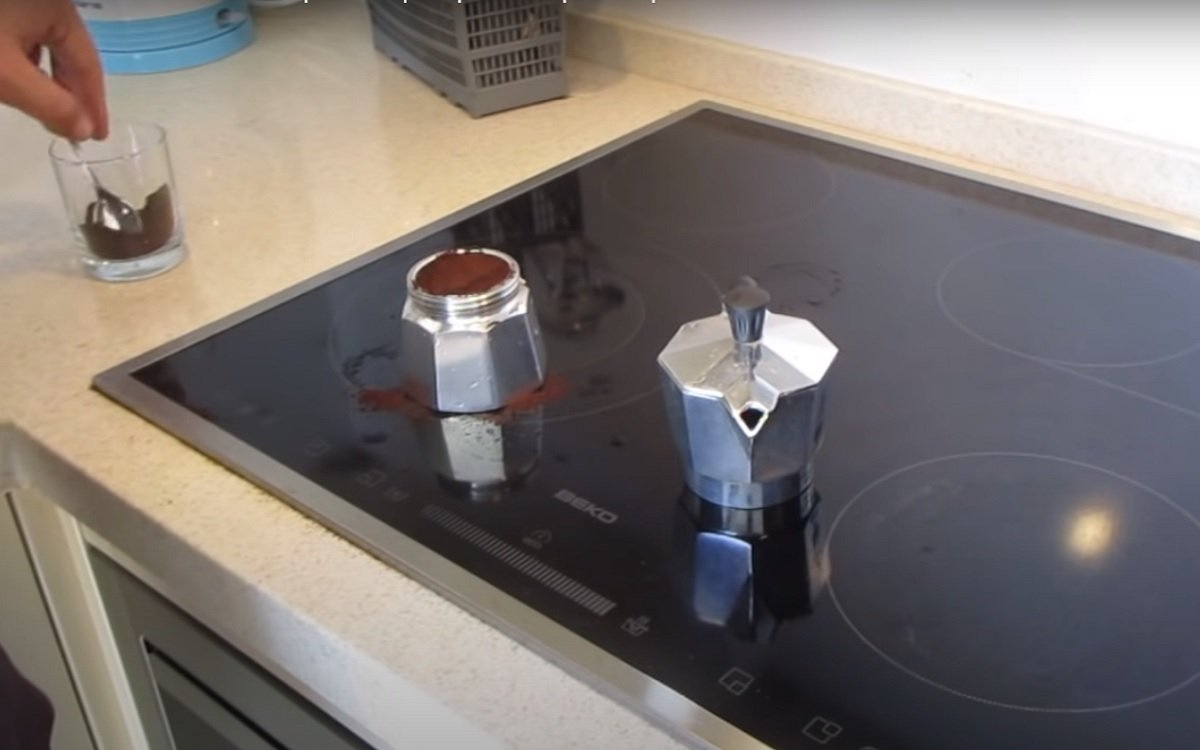 Mes užpildome filtrą kava iki krašto. Tada sujungiame apatinę kavos virimo aparato dalį su viršutine, pastatome jį ant viryklės ir uždarome dangtelį.