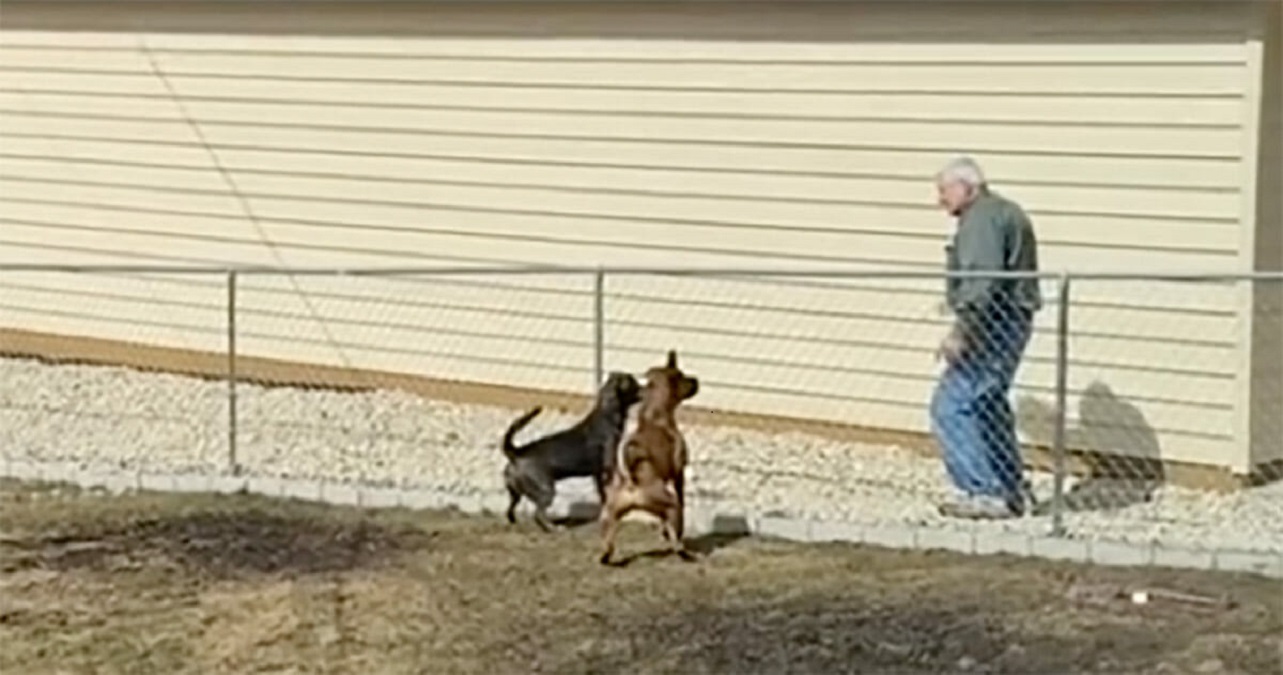 Vaizdo įraše matome, kaip šunys sėdi ir kantriai laukia kaimyno, ir kaip jie džiaugiasi jį pamatę.