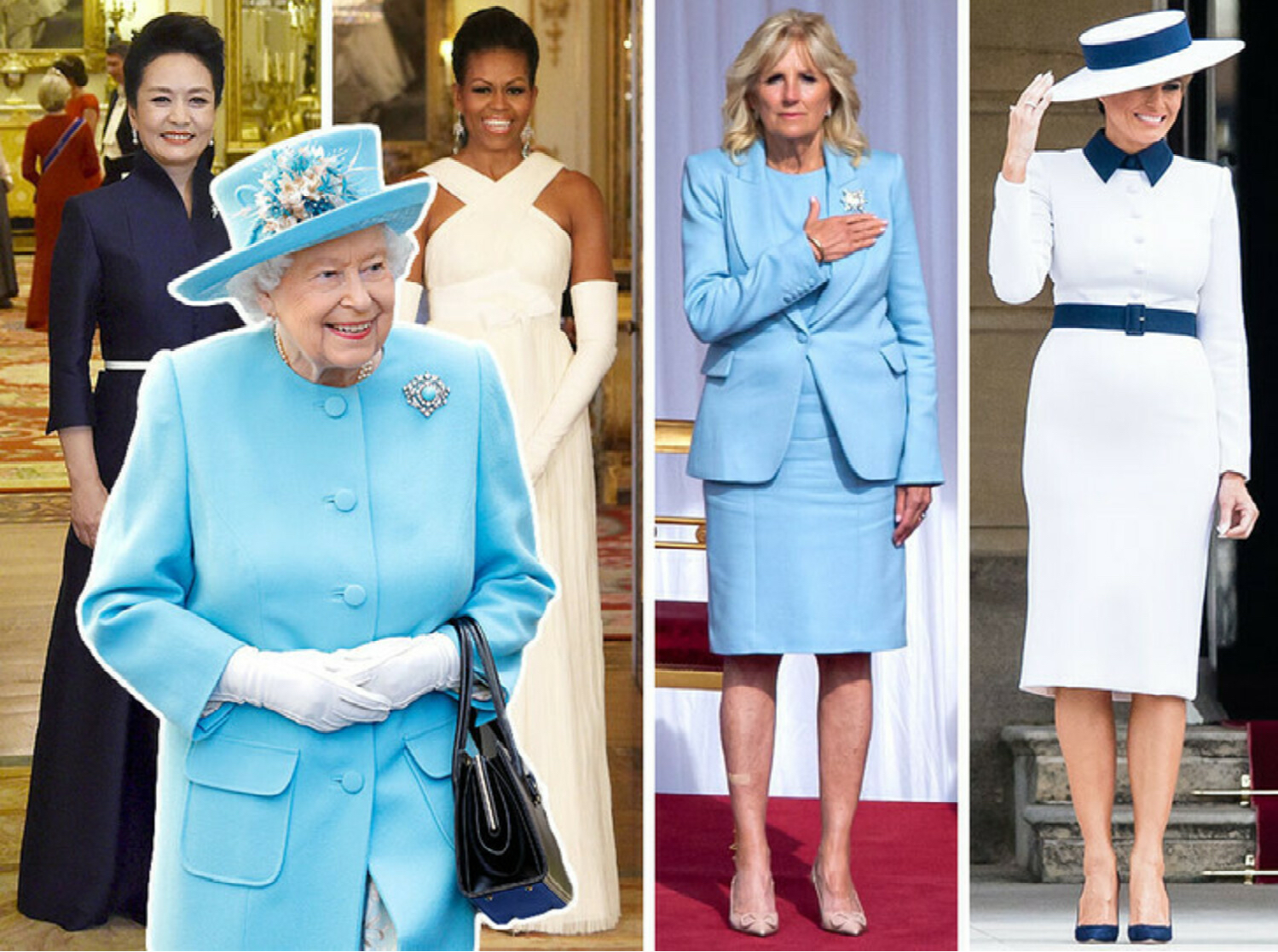 Galbūt šią išvaizdą galima laikyti ikoniškiausia iš visų apdarų, kuriuos pirmosios ponios kadaise pasirinko vizitui pas karalienę. 1961 metais Johnas Kennedy ir jo žmona Jackie atvyko į Londoną ir Bekingamo rūmuose susitiko su Elžbieta II ir princu Filipu. 35-oji JAV pirmoji ponia vilkėjo mėlyną Niujorko dizainerio Chez Ninon suknelę – prekės ženklą, kurį Kennedy dažnai dėvėjo gyvendama Baltuosiuose rūmuose.