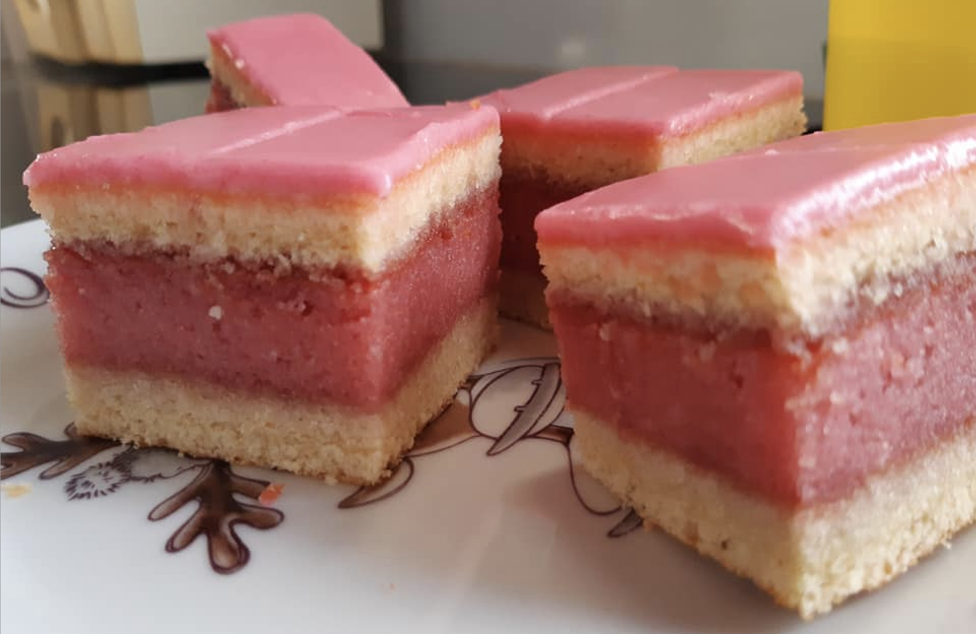 Ant šios tešlos sluoksniuokite raudoną tešlą ir viską gražiai išlyginkite.