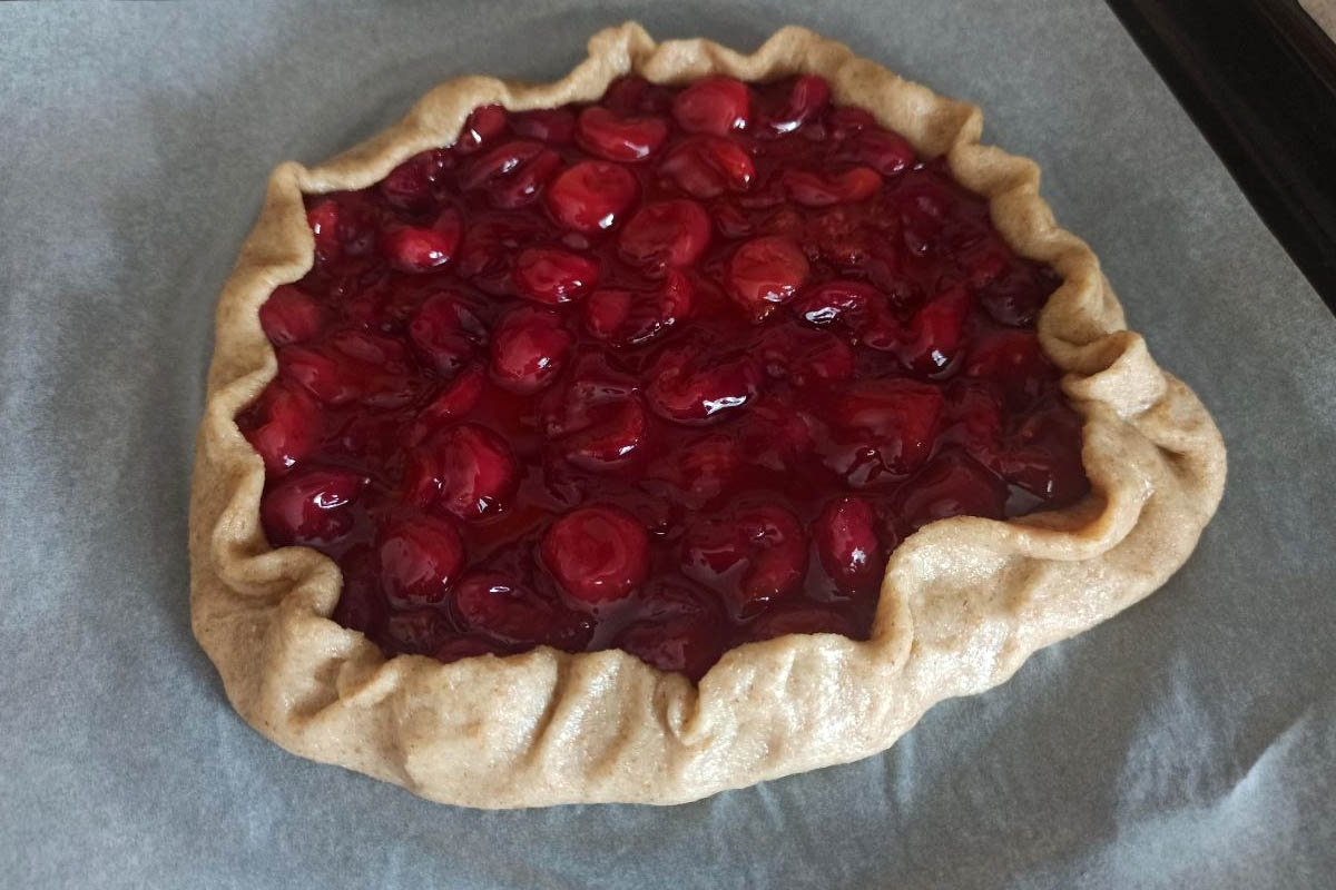 Kai vyšnios pradės virti, supilkite į jas kukurūzų krakmolą ir visą laiką maišydami užvirinkite mišinį. Įdaras turėtų labai sutirštėti. Nuimkite jį nuo ugnies. Įjunkite orkaitę iki 180 laipsnių temperatūros, kad ji spėtų įkaisti, kol formuosite galetę.