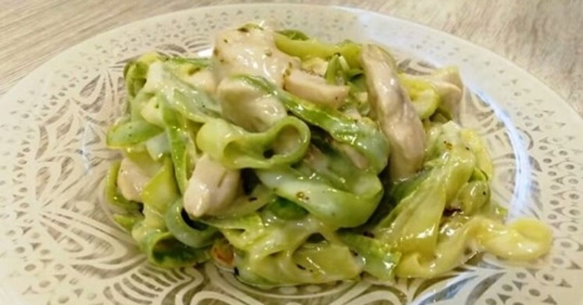 Į gerai įkaitintą keptuvę įpilkite aliejaus ir pakepinkite vištienos filė. Kepkite ant didelės ugnies nuolat maišydami, kol pasikeis mėsos spalva. Tada ją pasūdykite, paskaninkite pipirais ir susmulkintu česnaku. Tuomet sudėkite cukiniją, viską išmaišykite ir kepkite 4-5 minutes. Tuo metu greitai pagaminkite sūrio padažą.