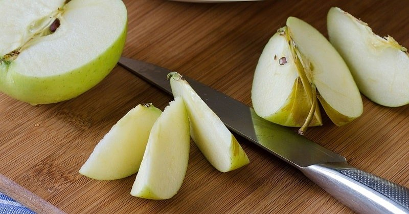 Obuolius nuplaukite, nulupkite, pašalinkite sėklytes ir žievelę, tada supjaustykite griežinėliais.