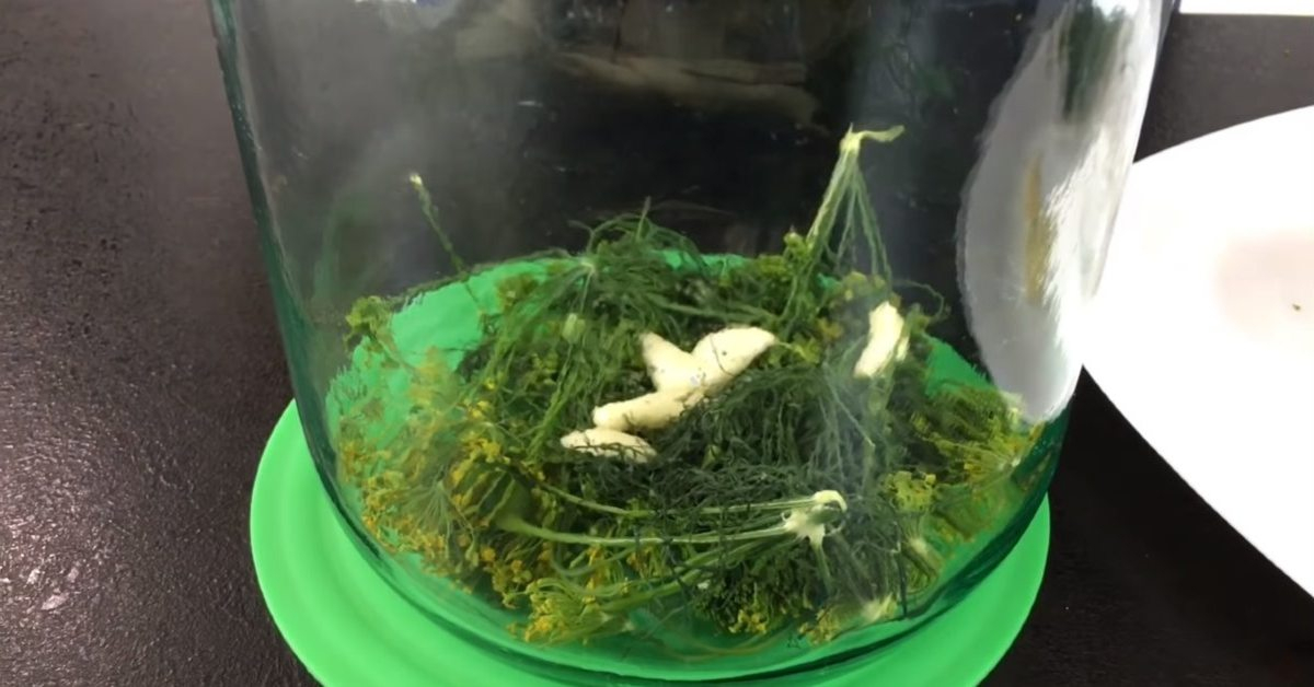 Česnakus nulupkite ir sudėkite į stiklainį kartu su krapais (pasilikite 2 krapų žiedus). Dideles skilteles geriausia perpjauti per pusę. Galite pridėti serbentų ir krienų lapų, kad būtų daugiau malonaus skonio.