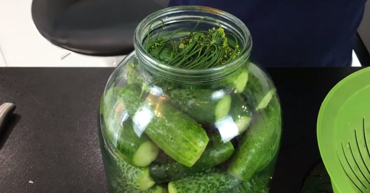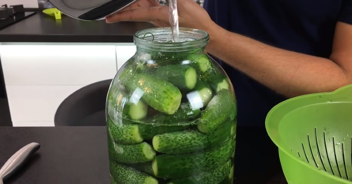 Užvirinkite vandenį ir užpilkite agurkus. Uždenkite stiklainį sandariai priglundančiu plastikiniu dangteliu ir šiek tiek pasukiokite, kad druska pasiskirstytų po indą.
