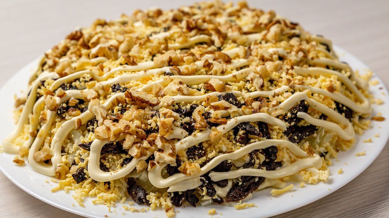 Serviravimo inde išdėliokite salotas sluoksniais. Pirma, vištienos filė, pasūdytą pagal skonį, sūrį, tada užtepkite majonezą plonu sluoksniu, sudėkite kiaušinių baltymus, obuolį, vėl majonezą, pabarstykite džiovintomis slyvomis ir tryniais, o tada vėl užtepkite šiek tiek majonezo (galite majonezą paskleisti tinkleliu, kad būtų gražiau). Papuoškite salotas mažais graikinių riešutų gabalėliais.