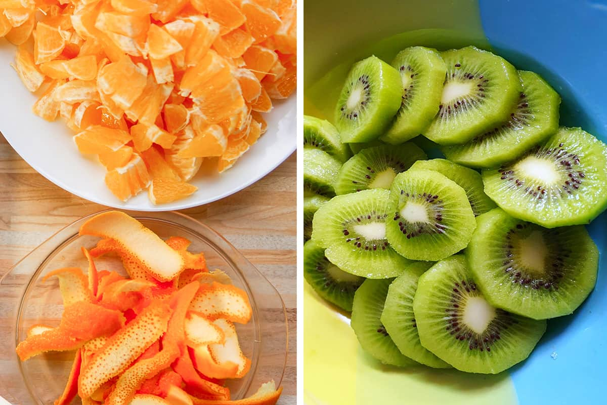 Pirmiausia nuplaukite ir nulupkite apelsinus ir kivius. Supjaustykite juos nedideliais kubeliais ir sudėkite į puodą. Vaisius užpilkite cukrumi ir atidėkite į šalį, kol išsiskirs iš jų sultys. Jei sulčių nedaug, galite įpilti 0,5 stiklinės šalto virinto vandens.