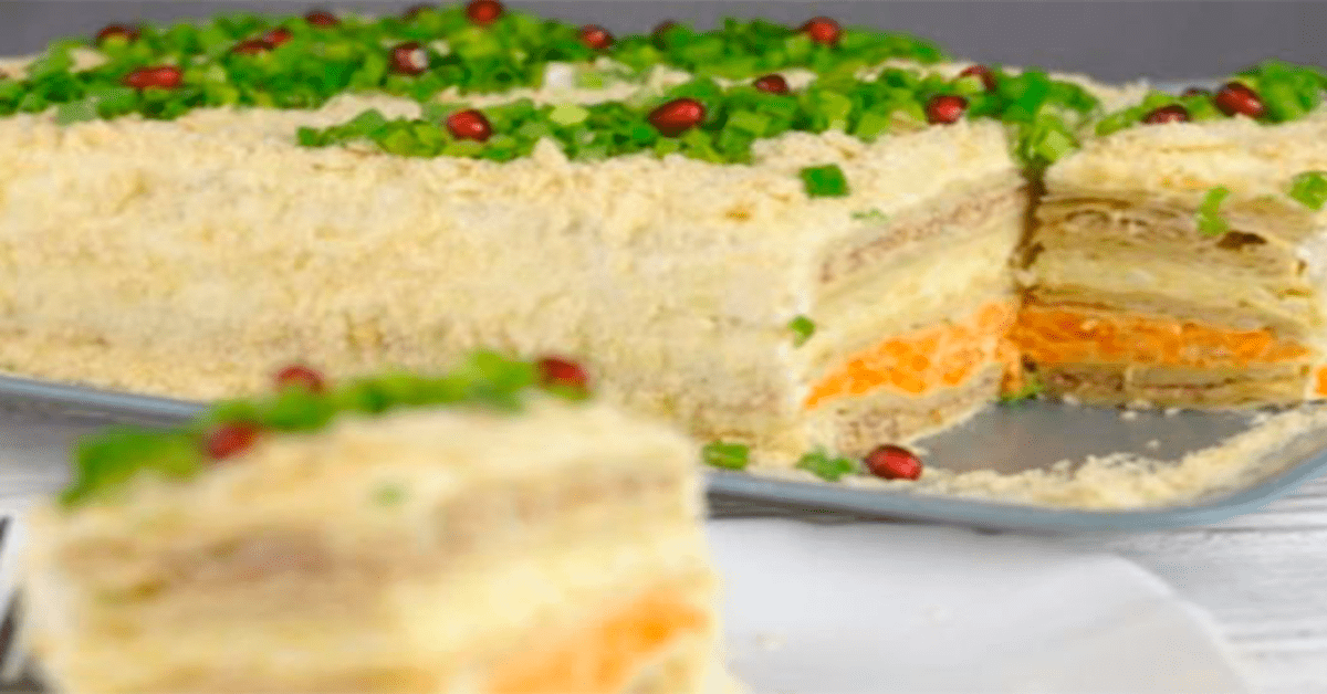 Nupjautus gabalėlius susmulkinkite iki trupinių ir apibarstykite torto viršų. Papuoškite smulkiai supjaustytais žaliaisiais svogūnais ir granatų sėklomis.