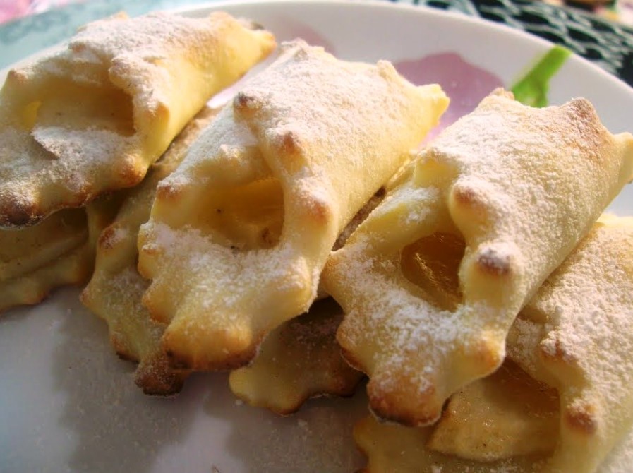 - Į kiekvieno kvadratėlio vidurį įdėkite po obuolių skiltelę, apibarstykite cukrumi ir cinamonu, suvyniokite ir užspauskite kraštelį.