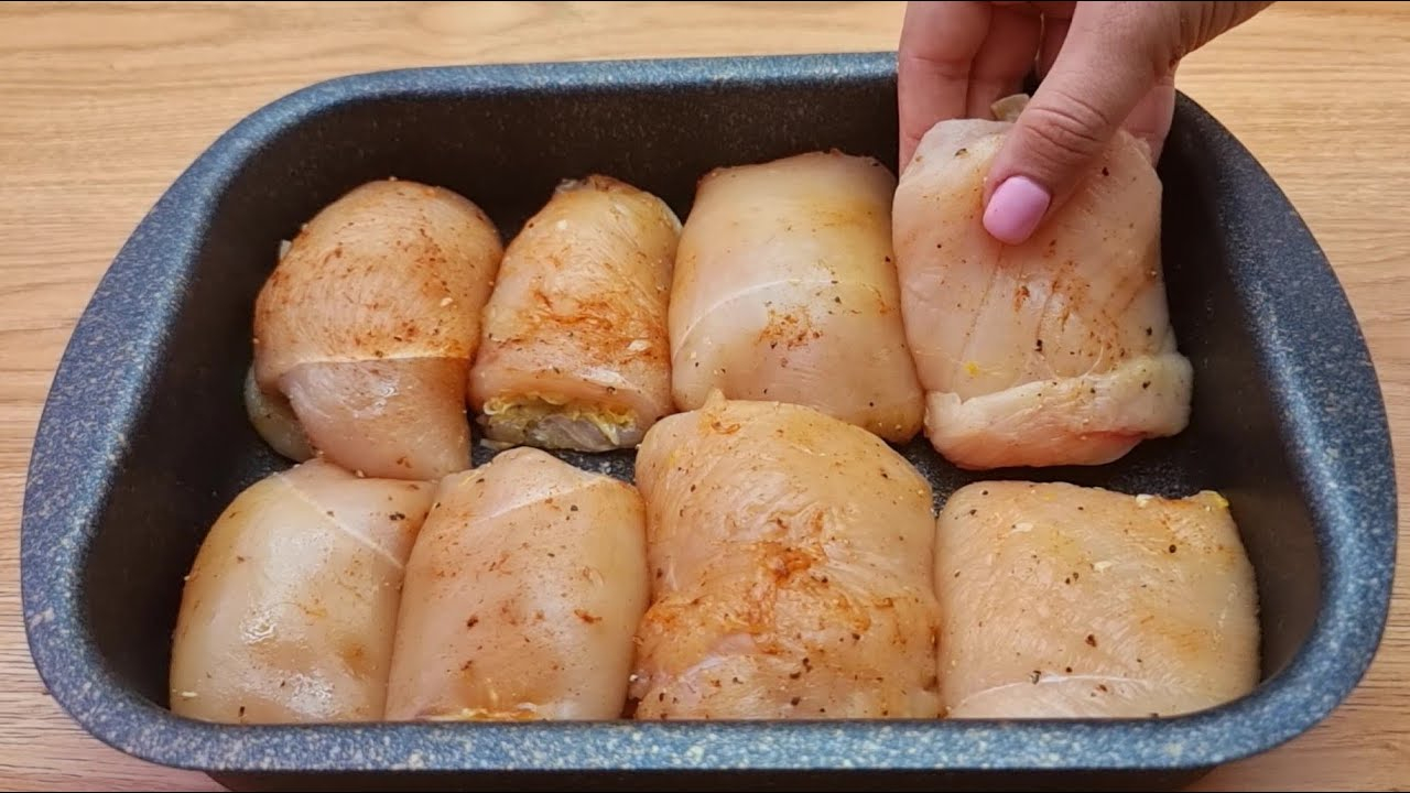 Tada šį mišinį dėkite ant vištienos griežinėlių ir susukite.