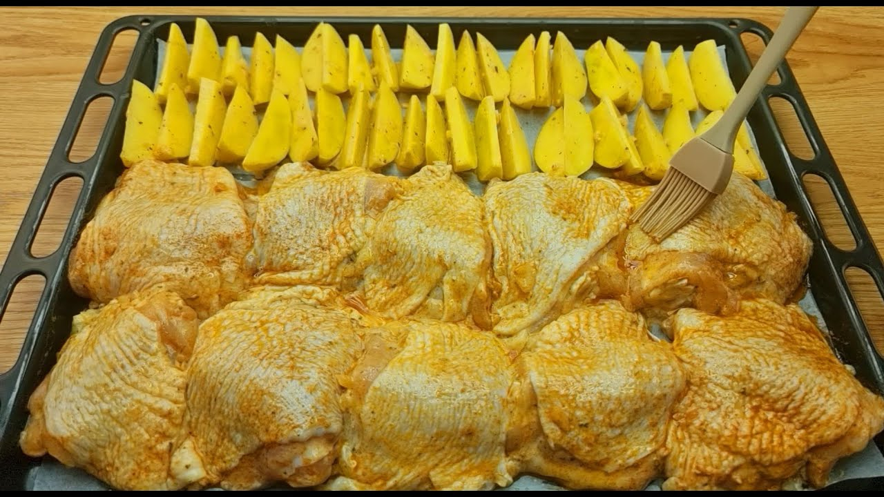Vienoje skardoje, kefyro marinate keptos vištienos šlaunelės su bulvėmis – skanūs ir greiti pietūs.