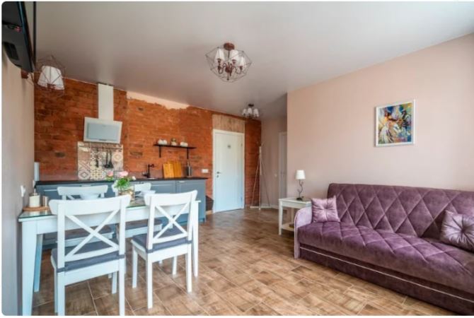 Svetainėje viena iš sienų taip pat liko iš plytų. Ją papuošė šviesiomis spalvomis. Baldai taip pat buvo parinkti atitinkamai. Kambarys atrodo erdvus ir stilingas. Ryškiu akcentu tapo sofa su aksomo apmušalais ir paveikslas.