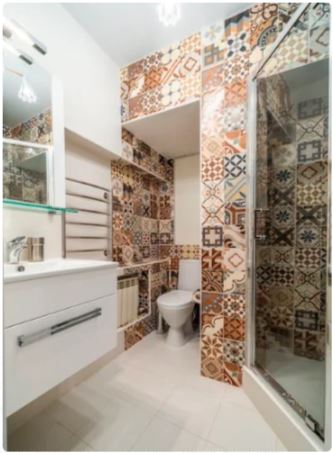 Kad papuoštų vonios kambarį, pora panaudojo mozaikines plyteles, o grindis padarė baltas. Niša buvo perdaryta į dušo kabiną.
