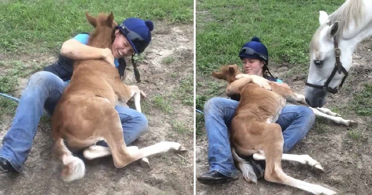 Tikrai nusišypsosite: kumeliukas pargriovė raitelį ant žemės ir ėmė žaisti