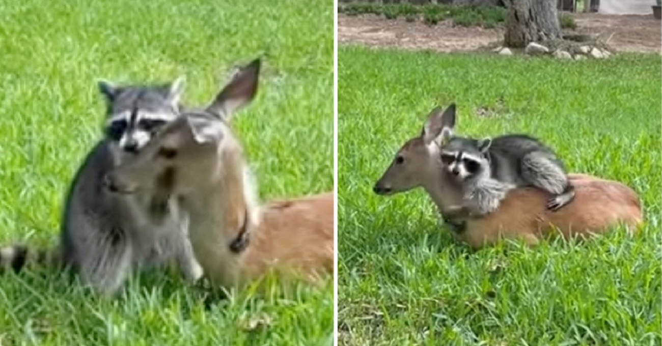 Išskirtinė draugystė: meškėnas vos pamatęs bėga apsikabinti elnę