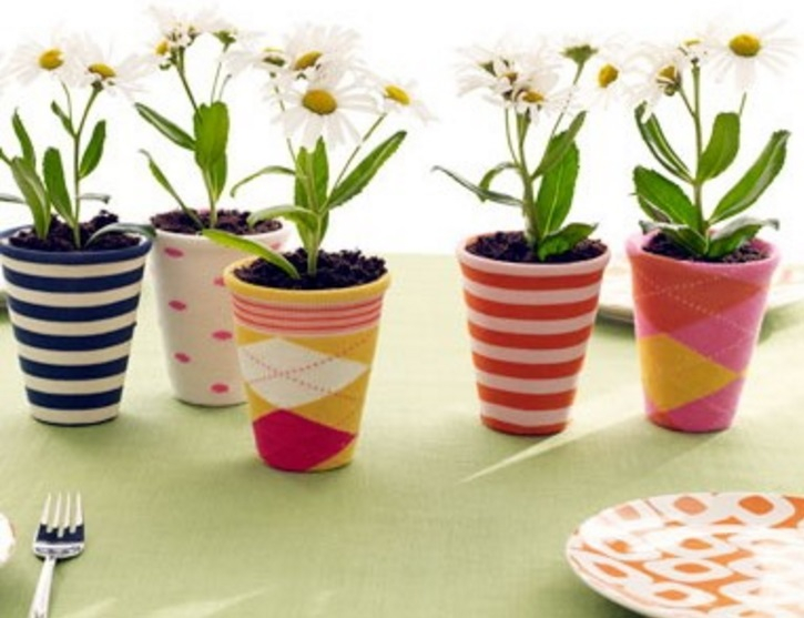 1. Nejau ne šaunūs šie vazonėliai? Iš pradžių jie buvo balti, o po to buvo dekoruoti senomis kojinėmis. Pasimėgaukite šiomis ryškiomis spalvomis!