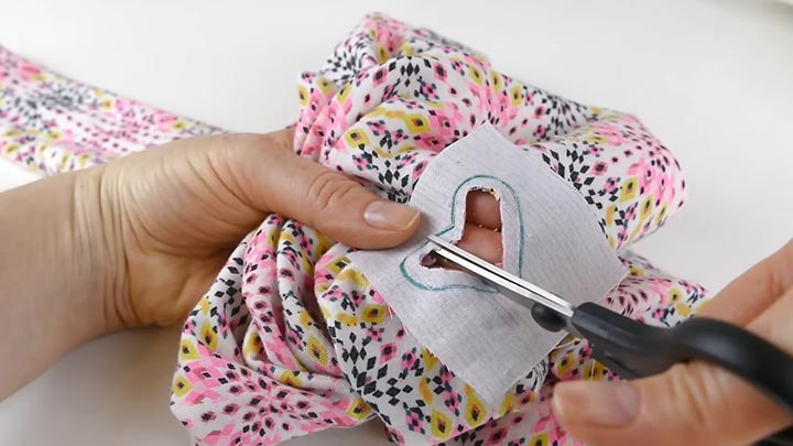 Sudygsniuokite aplink širdies kontūrą ir apsiūkite siuvimo mašina aplink išorinį širdelės kontūrą. Iškirpkite širdelės vidų, palikdami 0,5 cm iki siūlės. Įkirpkite medžiagos užlaidą, kad audinys nesigarankščiuotų.