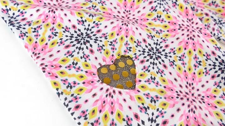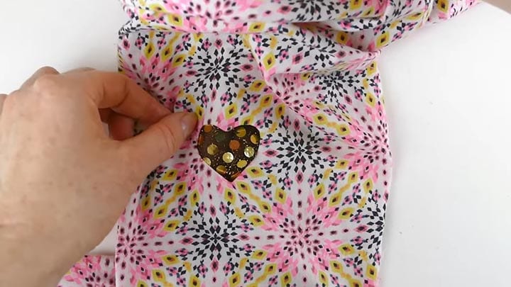 Ant audinio nupieškite širdelę, didesnę už skylutę. Širdelę uždėkite ant drabužio gerosios pusės esančios skylutės vidurio.